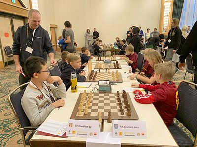 2024-01-01 (RK) Zum 2. Mal darf unser Verein an den Deutschen Vereinsmeisterschaften u10 teilnehmen. Mit unserem starken u10-Team, das souverän die Landesmeisterschaft MV gewonnen hat, wären wir stark genug, im Mittelfeld mitzuspielen. Doch leider - die Nr. 2 und 3 unseres Teams, Aram und Thore, konnten nicht mitmachen. Es spielten Nhat Nam, Tim, Alex und der nachrückende Johannes, der erst seit kurzer Zeit vom Anfängertraining zum Dienstagstraining wechselte.