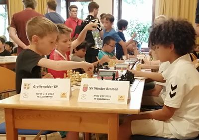 2023-10-21 (RK) Die diesjährige Saison begann für uns mit dem Nachwuchs. Dieser hatte sich als Vizelandesmeister für die NVM u12 vom 6.-10.9.23 in Magdeburg qualifiziert. Wir traten mit Nhat Nam, Aram, Leo und Alex an. Tim sagte ab, Thore musste kurzfristig wegen Krankheit passen. Als (vermutlich) jüngstes Team - alle können nächste Saison noch einmal starten, die meisten noch mehrere Jahre - war unser Ziel, den letzten Platz zu vermeiden. Die Startrangliste sah uns auf Platz 14 von 16 Teams, wir waren eines der drei Teams mit einem DWZ-Schnitt unter 1000.